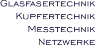 Zur Zeit befindet sich unsere Website noch im Aufbau. Wir werden uns bemühen, Ihnen so schnell wie möglich das gesamte Spektrum zu präsentieren. Aktuell können Sie sich schon einmal über unsere Tätigkeiten informieren. Der Schwerpunkt unserer Präsenz wird auf  Lichtwellenleiter - Techniken basieren. Dieser Bereich wird sicher von großem Interesse für Sie sein. Schauen Sie doch einfach demnächst noch einmal vorbei!